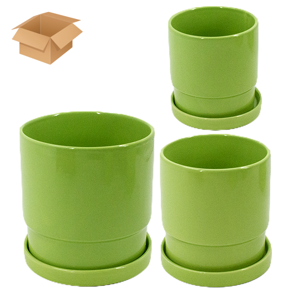 Кашпо керамическое 3шт с поддоном зеленый (Ø-11см h-12см / Ø-12см h-13см / Ø-16см h-17см)