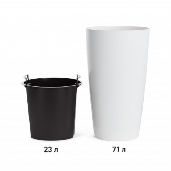 Состоит из внутренней вставки и горшка. Дно вставки оснащено высокими столбиками с отверстиями, благодаря которым лишняя вода не задерживается и корневая система цветка не портится. Практичные выдвижные ручки обеспечивают удобство при пересадке, переноске и уходе за растениями. Максимальный вес нагрузки на ручки - до 20 кг.