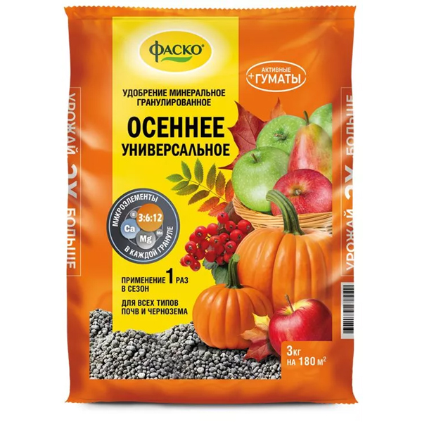 Смешанное Осеннее универсальное минеральное удобрение (тукосмесь) с микроэлементами. Рекомендуется для подкормки или внесении перед посадкой для плодово-ягодных, луковичных и цветочно-декоративных культур.